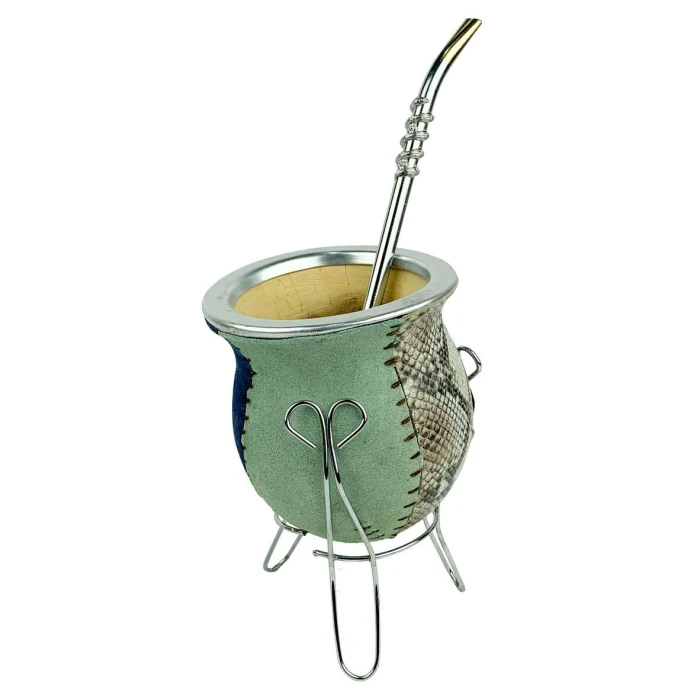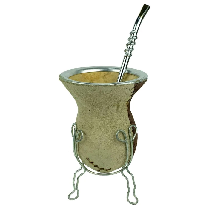 01 Cuia para chimarrão com bomba + tripe detalhes em couro 115 belmate