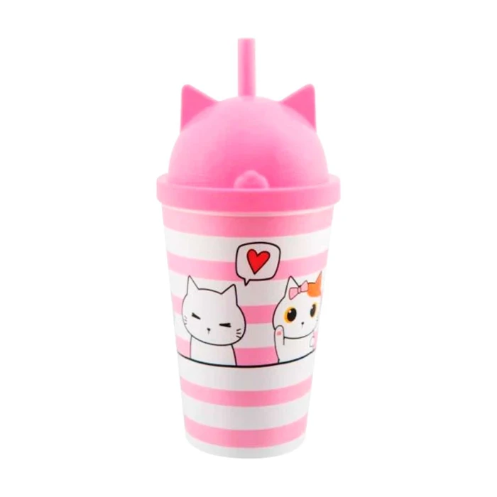 Copo plastico com canudo 350ml cat rosa