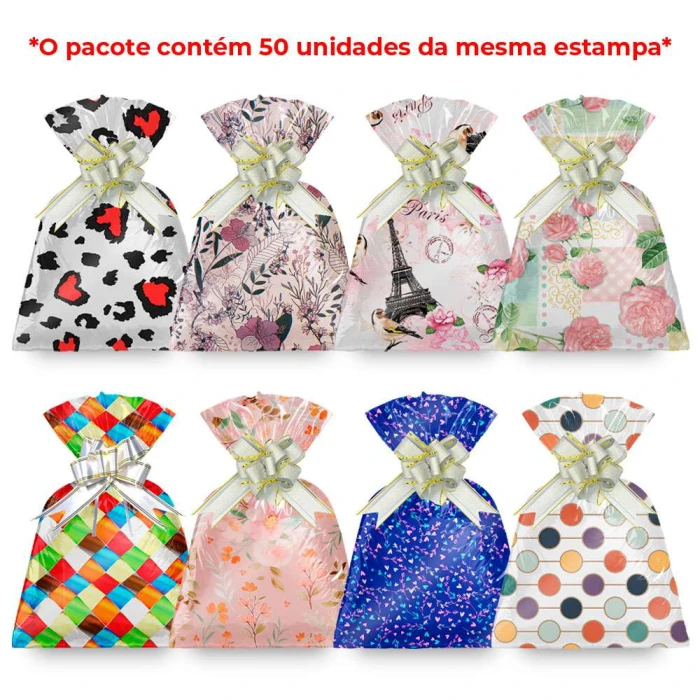 01 Pacote com 50 unidades de saco metalizado 20x29cm feminino modelos variados